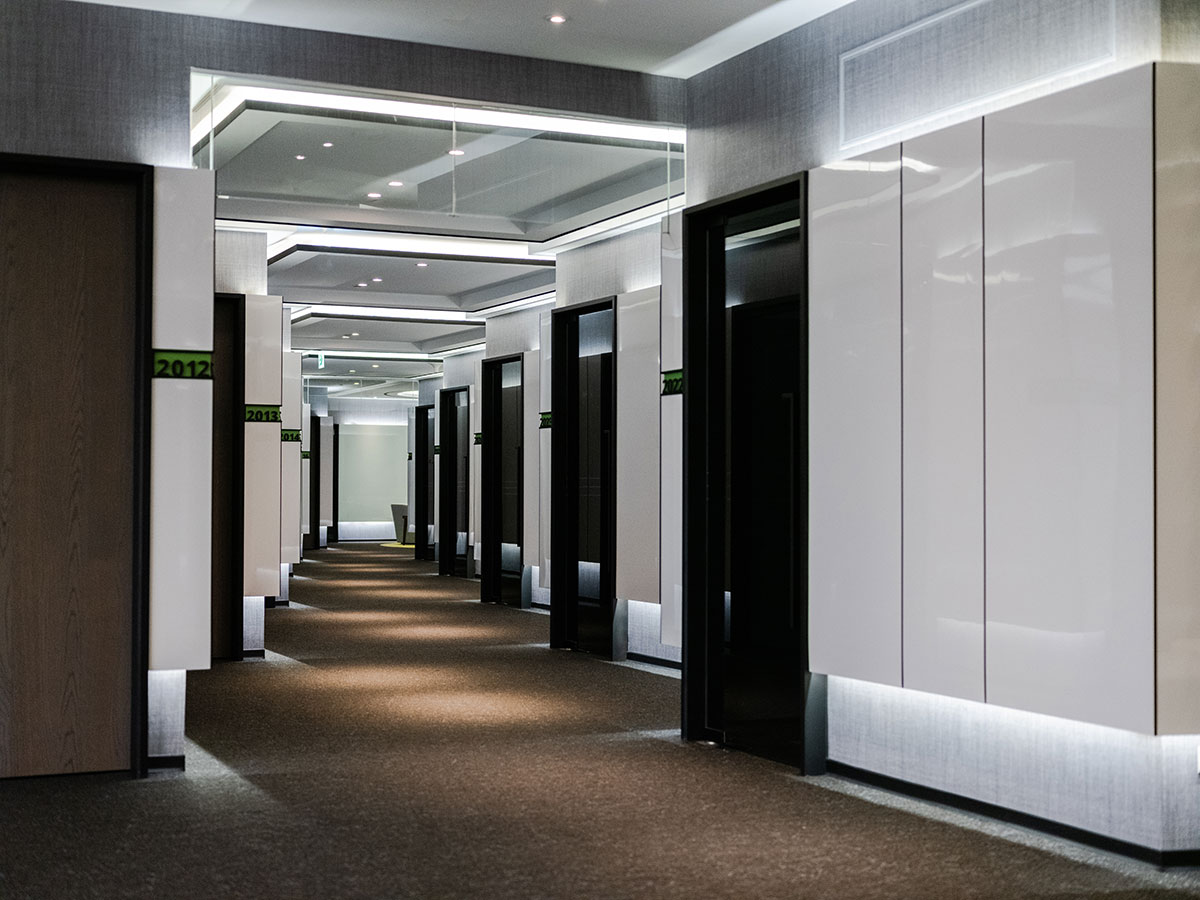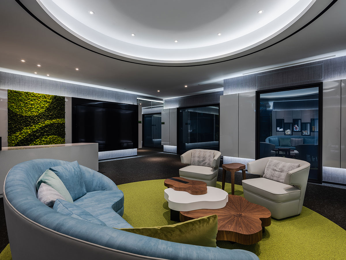 The metaphor of the brand “Green Dot” is implicitly embedded in the ceiling, floor and wall. At the same time symbolize the meaning of "harmony and cohesion". It is also like the common business pie chart in office hours, explicated the "corporation image" in the space. In the reception hall, the vault extends to the counter in arc line of a circle, which is different from the previous planning of square layout. We use the cylindrical design to echo the corporate image. And at the same time in the pure white tones of the spread, the space is pervading an open-minded sense and professionalism. On the main visual wall, the lines outlined by moss not only last the image of "Green House", but also has the effect of absorbing moisture and regulate air. It also takes into account the image vision and function application. It echoes the green curtain design at the corridor, and with different forms of "green" to present the original tenet of the enterprise. In the staff dining area, the solid wood hollow-out trees and clouds image design, with industrial lightings and simplified stripe furniture collocation, initiate a lively dining atmosphere.