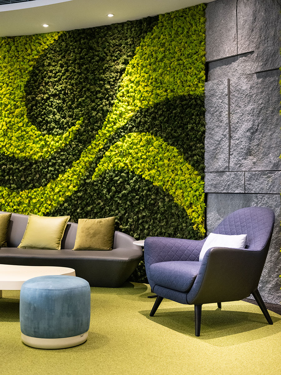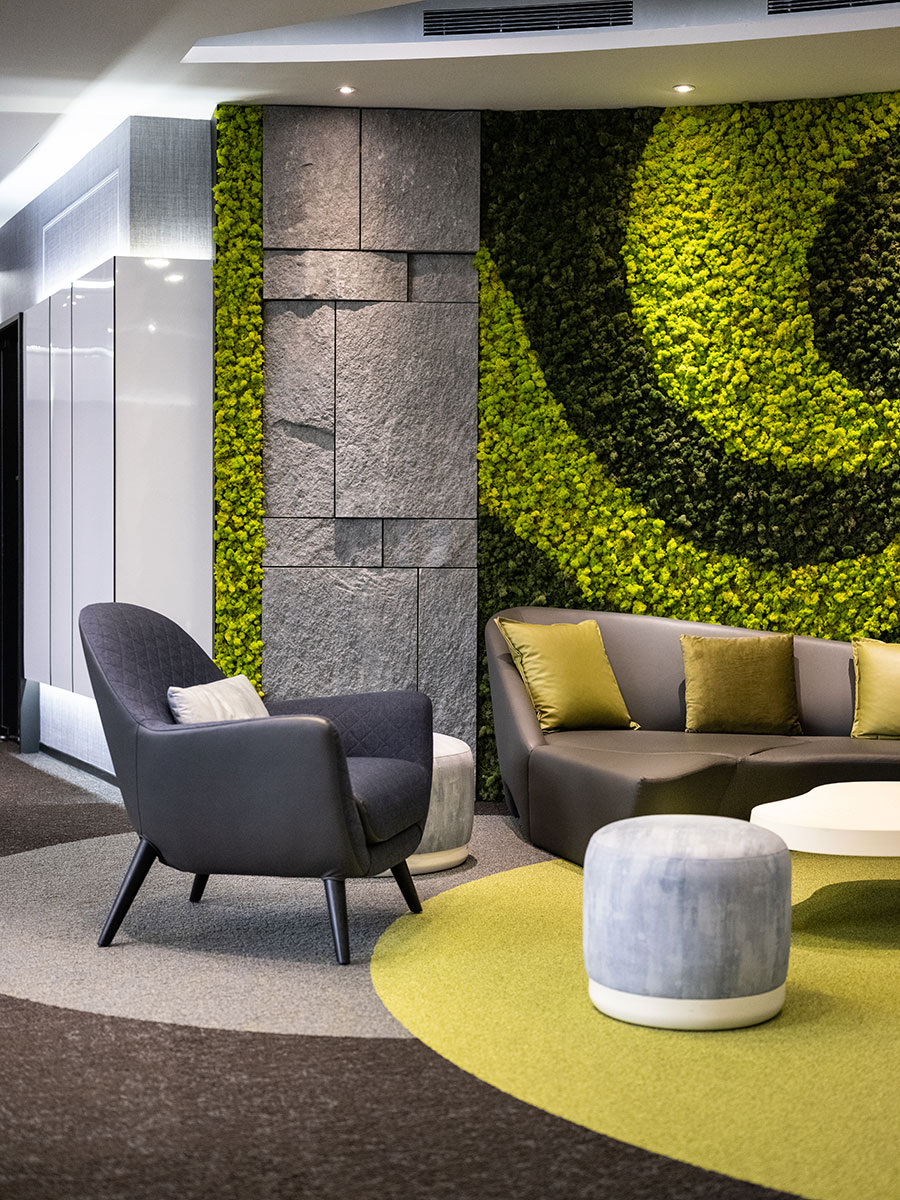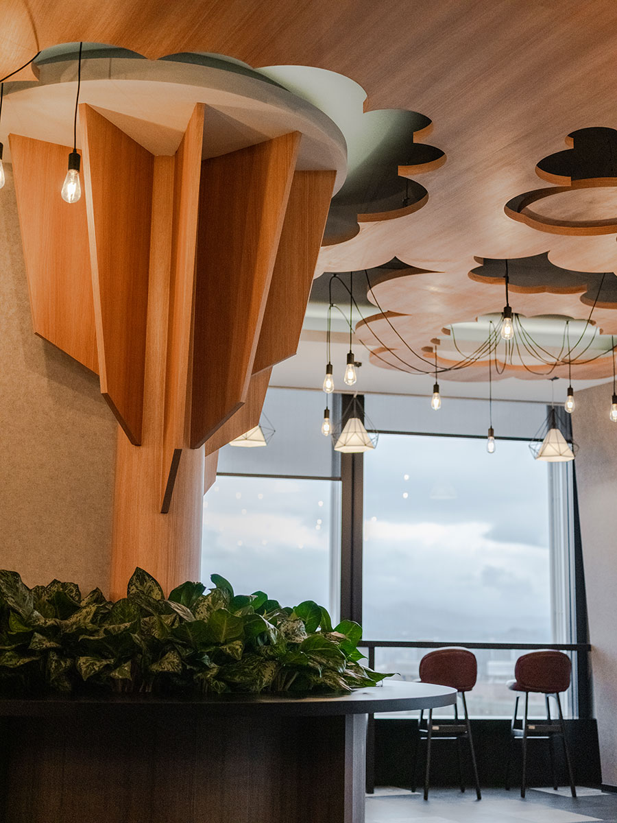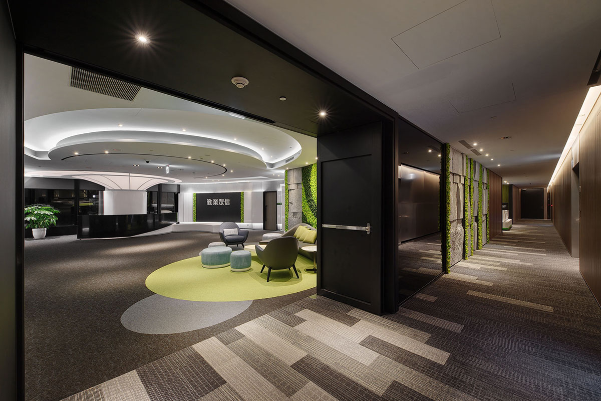 天地壁中隱約置入品牌Green Dot的隱喻,同時象徵「圓融、凝聚」之意,亦如平日辦公時常見的商業圓餅圖,空間中盡顯形象的轉譯。接待大廳中穹頂以弧線的圓延伸至櫃檯,有別以往的方正格局規劃,我們透過圓柱設計來呼應企業形象,同時在純白色調的鋪展下,為空間挹注大氣、專業感。而主視覺牆上,馴鹿草勾勒出的線條,除了讓Green House的意象得到延續,更有吸取濕氣、調節空氣的效果,兼顧了形象視覺與機能應用,和廊道處的綠簾設計遙相呼應,用不同形式的「綠」呈現出企業初旨。員工用餐區中,大片實木鏤空設計轉化的樹木、雲朵形象,搭配工業風燈飾及簡約線條家具,圍塑出鮮明活潑的用餐氛圍。