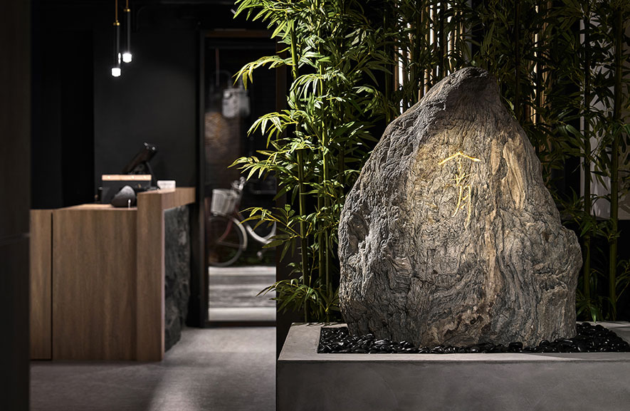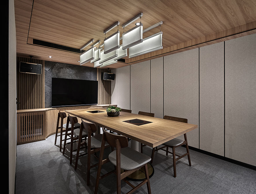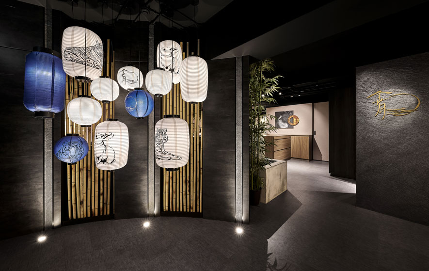發想自品牌「金月」之「月」字,簡兆芝室內設計 簡兆芝 主持設計師 以「月圓」的形象為主軸,從店面主視覺牆、客席區卡式座椅、鍋物餐具等皆融入「圓」的形貌,將其圓滿、團圓的美好寓意傳達予每位顧客,同時回應高端日式鍋物店的定位,運用原石、石皮、木皮、金屬等現代建材,結合日本竹子與傳統燈籠,表現古今交融的和風禪韻,並於其中體現我們積極找尋各式平衡的理念,透過和諧的設計手法與講究自然的料理彼此相襯,建構食材與空間對話的橋樑,進而築起用餐者與料理者的共鳴,達成場、人、食三者平衡圓滿的狀態。
