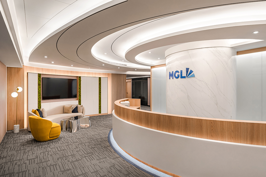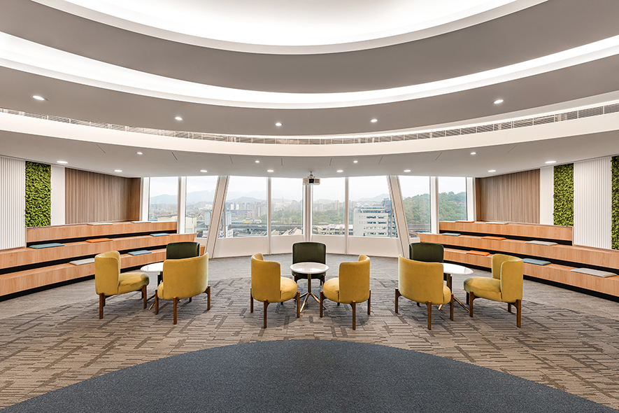一反商場上主打的高科技產品,在人們行動交流的此處,圓滿與自然才是主軸──三道斜落的品牌標誌排成弧型,化為接待處內方外圓的銅錢意象,祝福企業的美好前景;藉清玻牽引入室的山水麗景間,色彩明亮的軟裝紛呈,共展彈性化、年輕且時尚的新商辦設計。