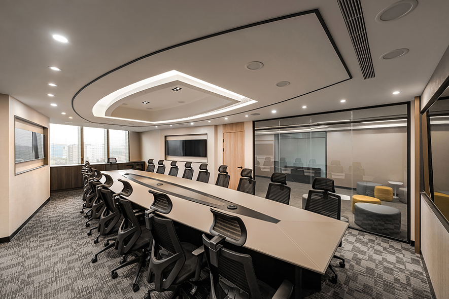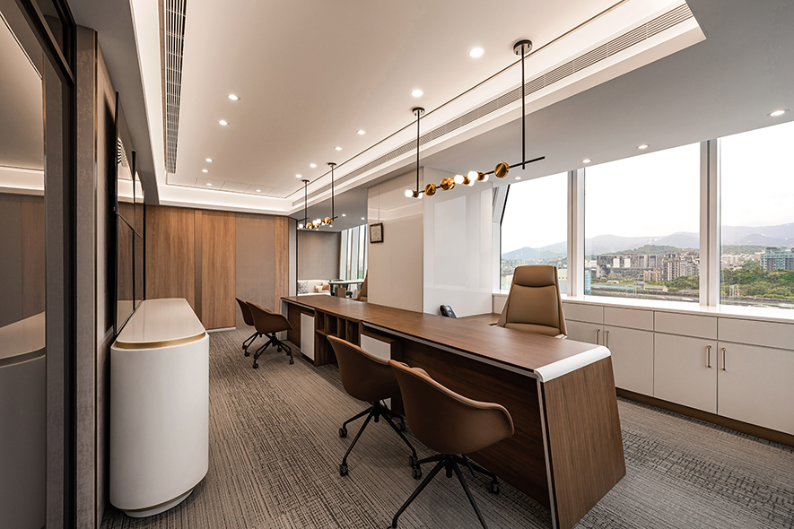 回應業主將「人」視作辦公室核心的理念,簡兆芝室內設計 簡兆芝 主持設計師 跳脫對精密儀器製造業的高科技想像,導引戶外風景、陽光進入半開放式商空,與永生馴鹿苔共築自然清新的工作環境,此外,本案選用智能電控玻璃取代部分隔間牆,兼具隱私和通透感,且依據超高層建築的法規施作嚴謹工程,給予員工具保障的安全職場。