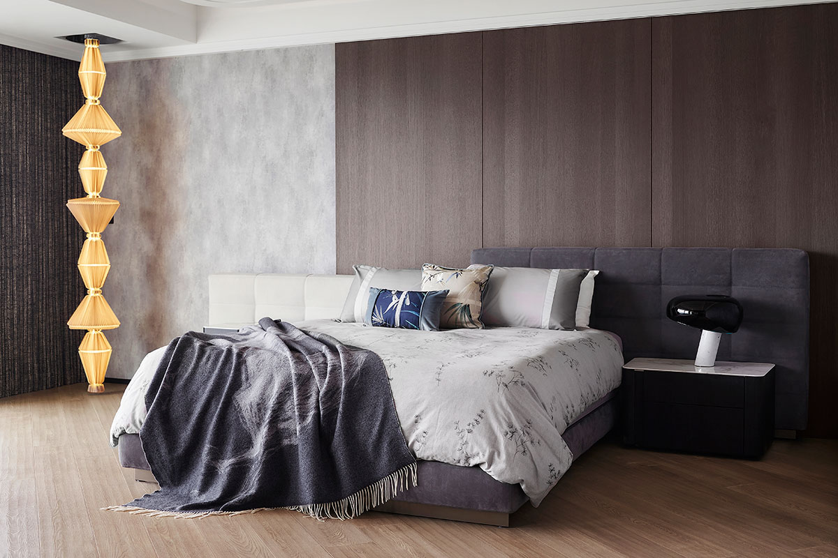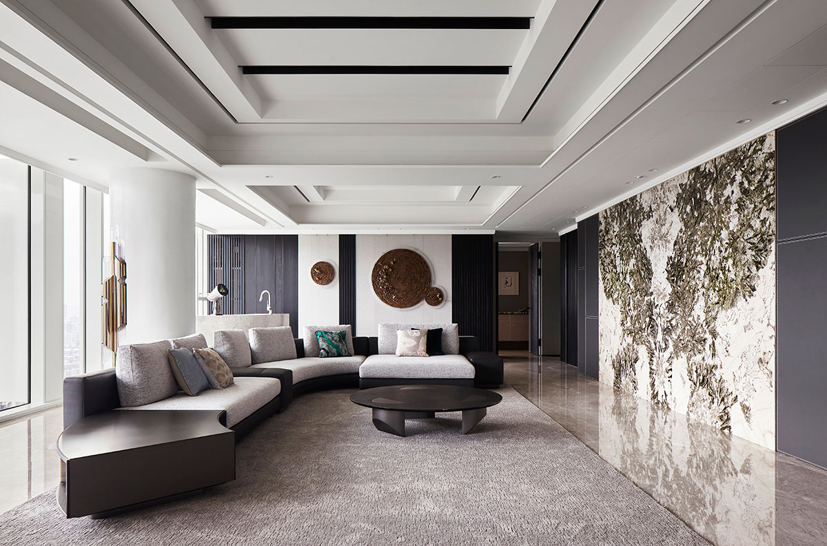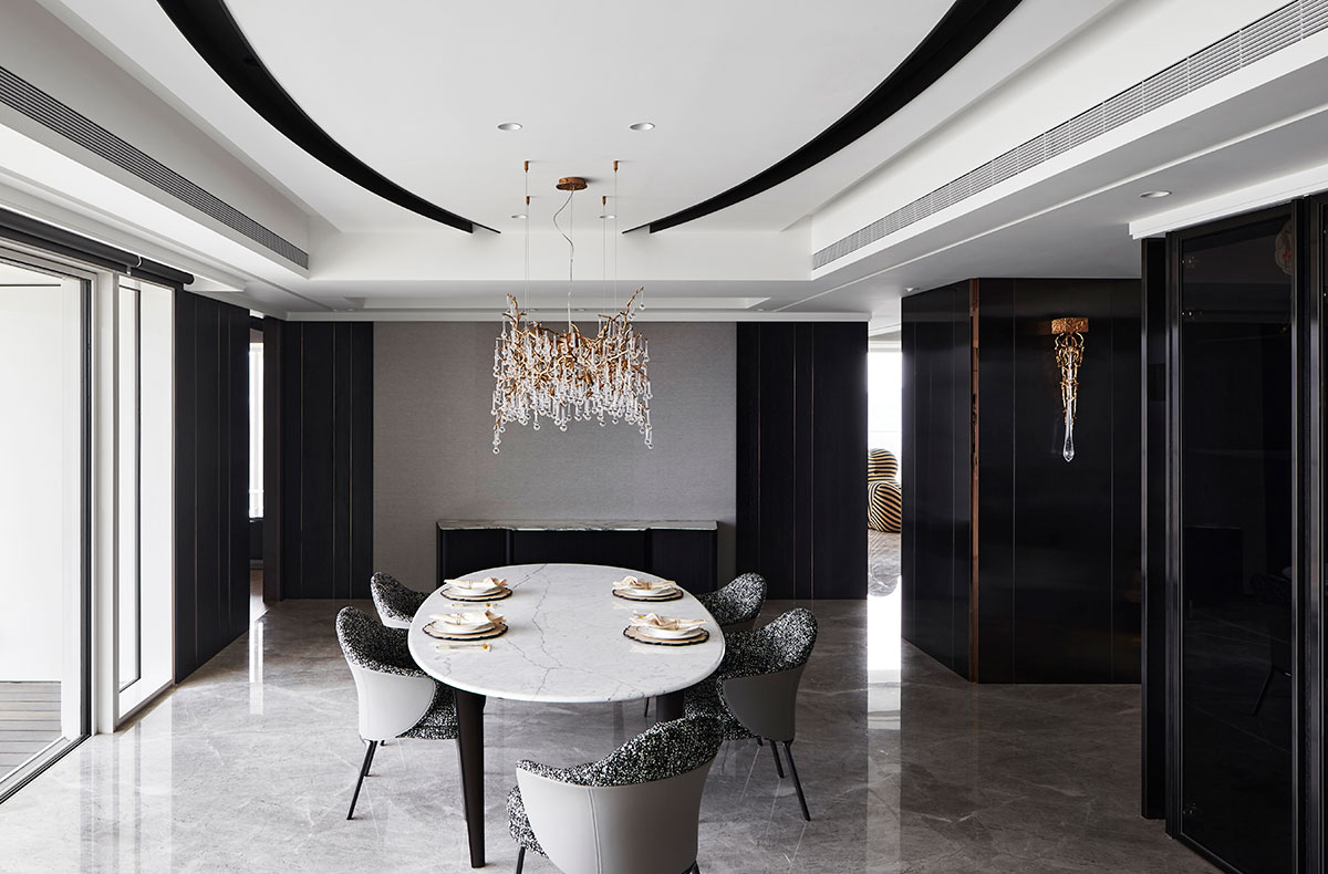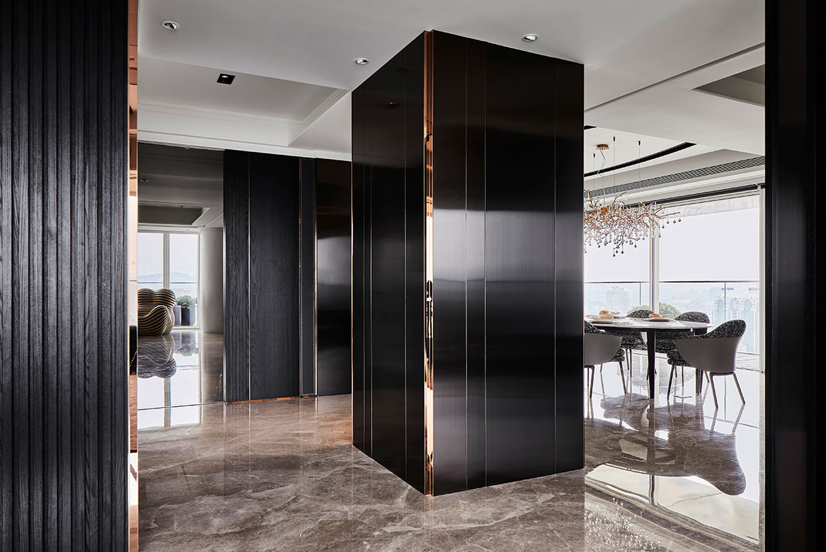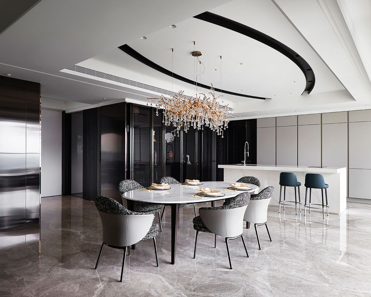 以現代簡約的義大利沙發為家宅規劃核心,並悉心調配用色、材質、光線、家具等配置,在偌大場域實踐「空間平衡」的設計理念;公領域採用開放式格局,私領域則維持使用獨立性,同時為各區天花板形塑獨特造型,化用結構梁柱為特殊擺設,輔以便利家電、環保地坪,打造兼具美感與機能的素雅家宅。