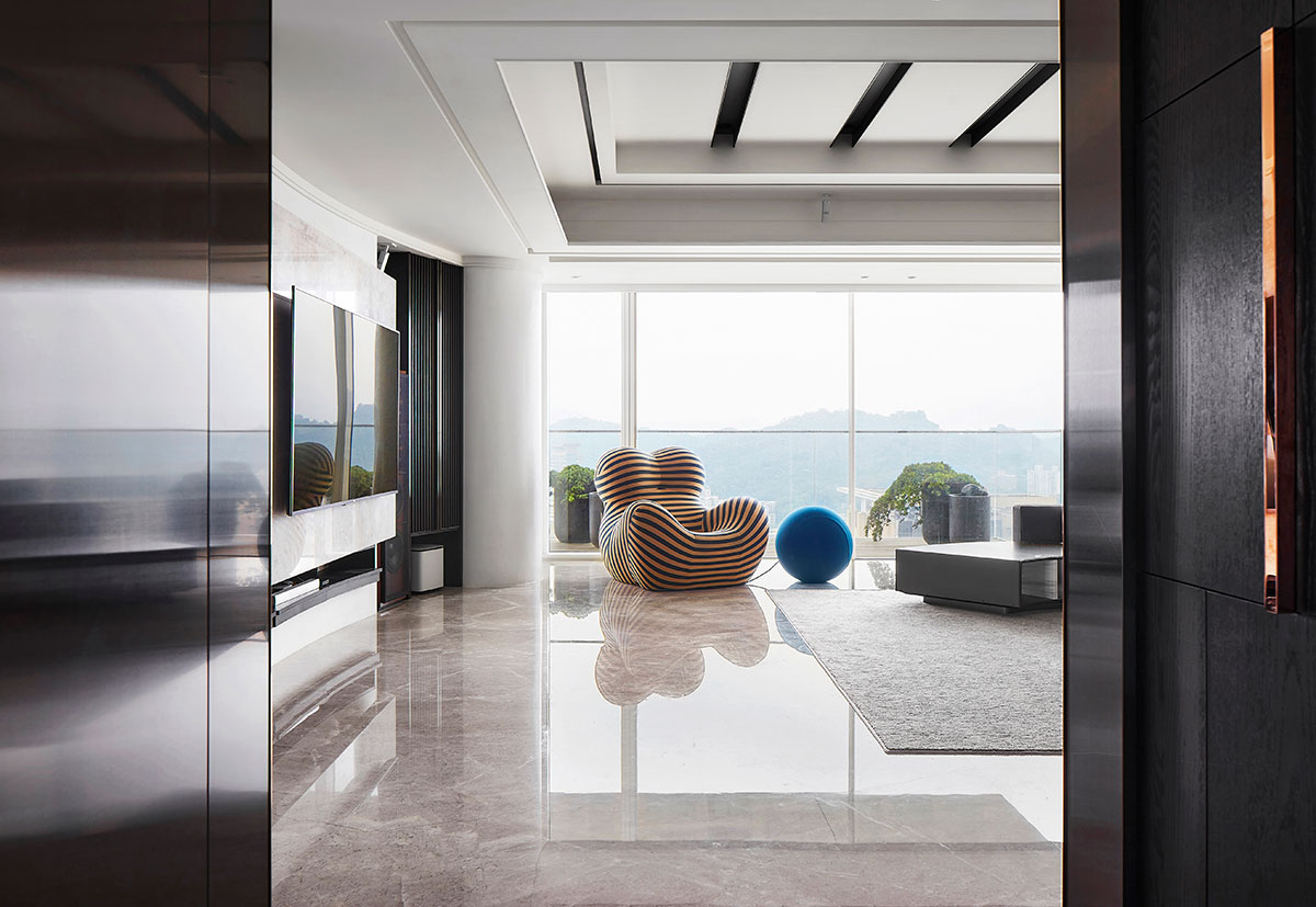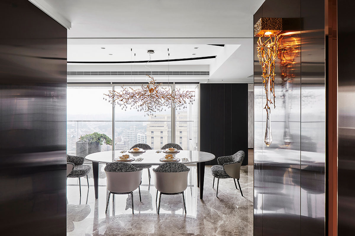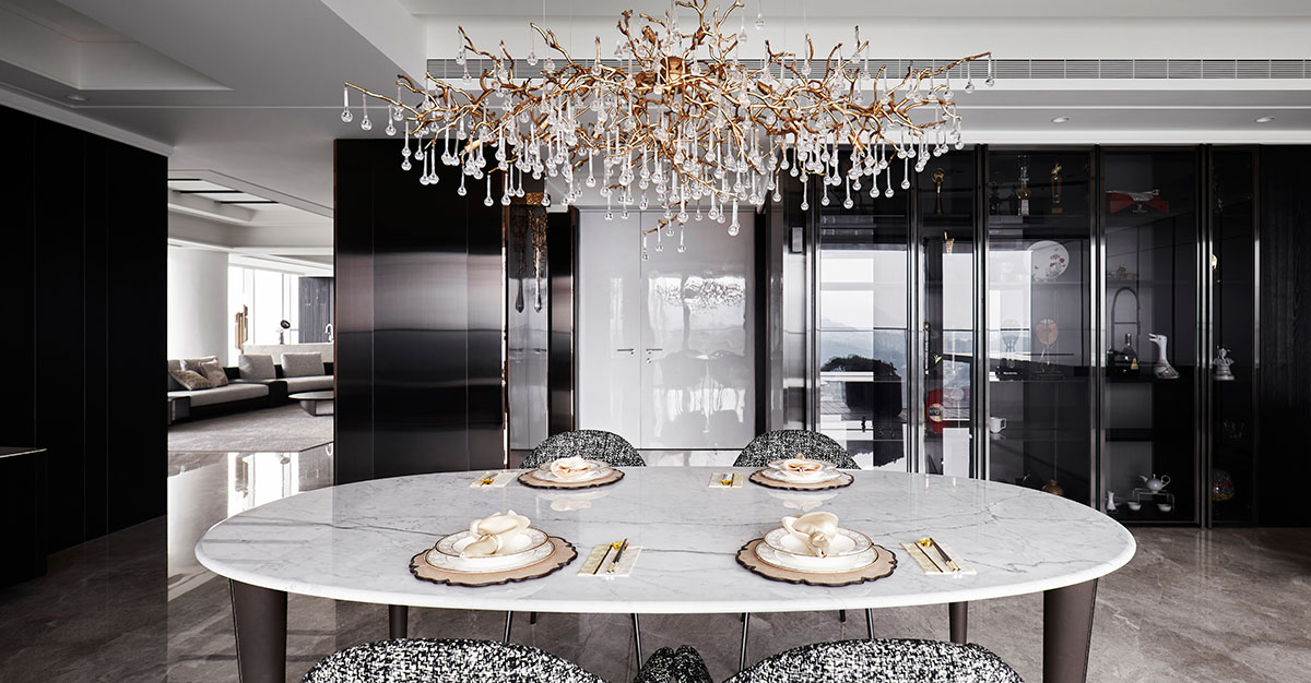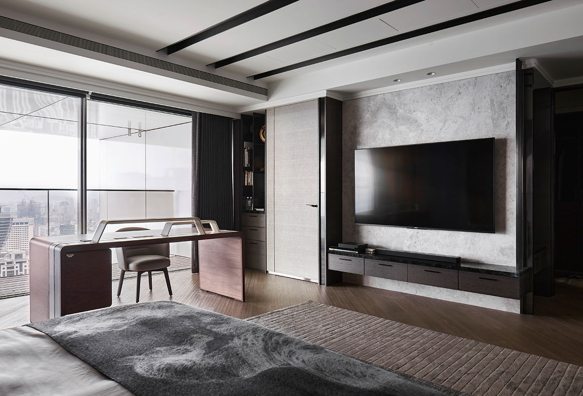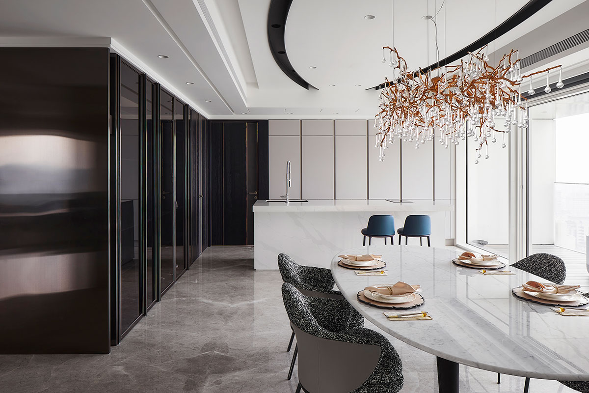 以現代簡約的義大利沙發為家宅規劃核心,並悉心調配用色、材質、光線、家具等配置,在偌大場域實踐「空間平衡」的設計理念;公領域採用開放式格局,私領域則維持使用獨立性,同時為各區天花板形塑獨特造型,化用結構梁柱為特殊擺設,輔以便利家電、環保地坪,打造兼具美感與機能的素雅家宅。