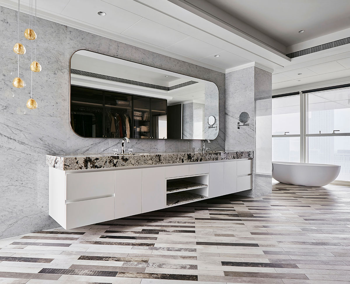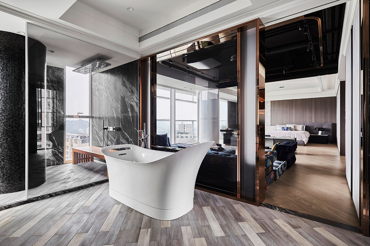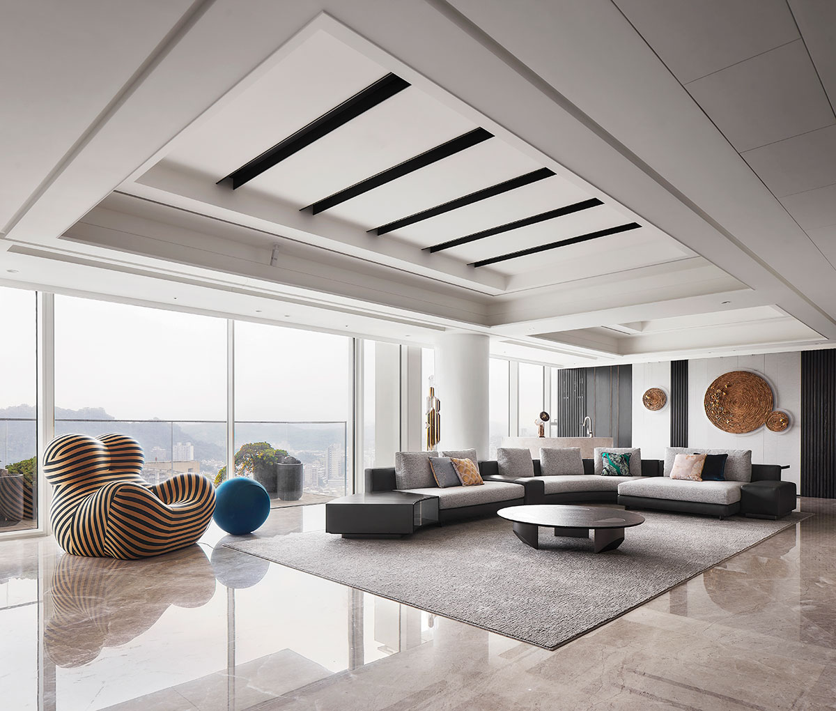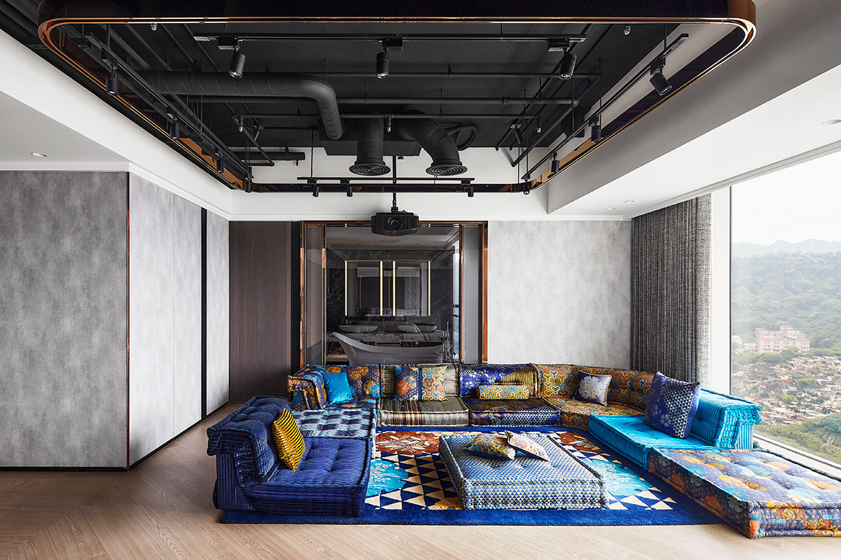 以現代簡約的義大利沙發為家宅規劃核心,並悉心調配用色、材質、光線、家具等配置,在偌大場域實踐「空間平衡」的設計理念;公領域採用開放式格局,私領域則維持使用獨立性,同時為各區天花板形塑獨特造型,化用結構梁柱為特殊擺設,輔以便利家電、環保地坪,打造兼具美感與機能的素雅家宅。