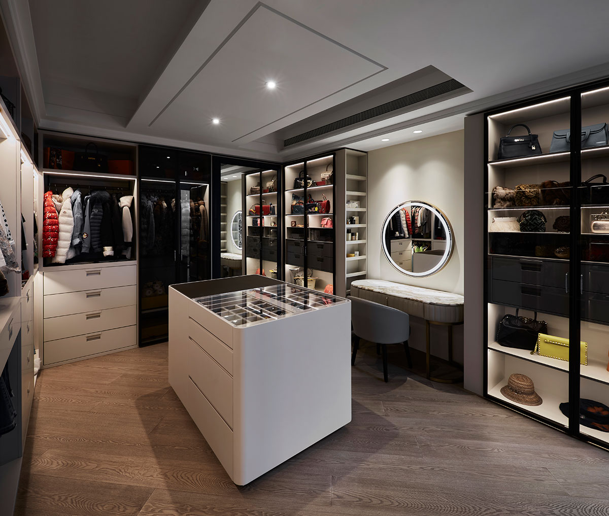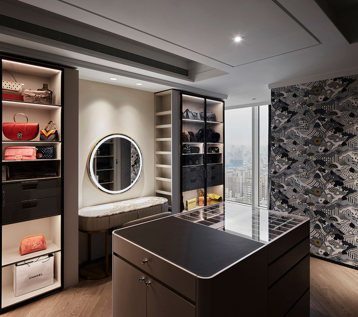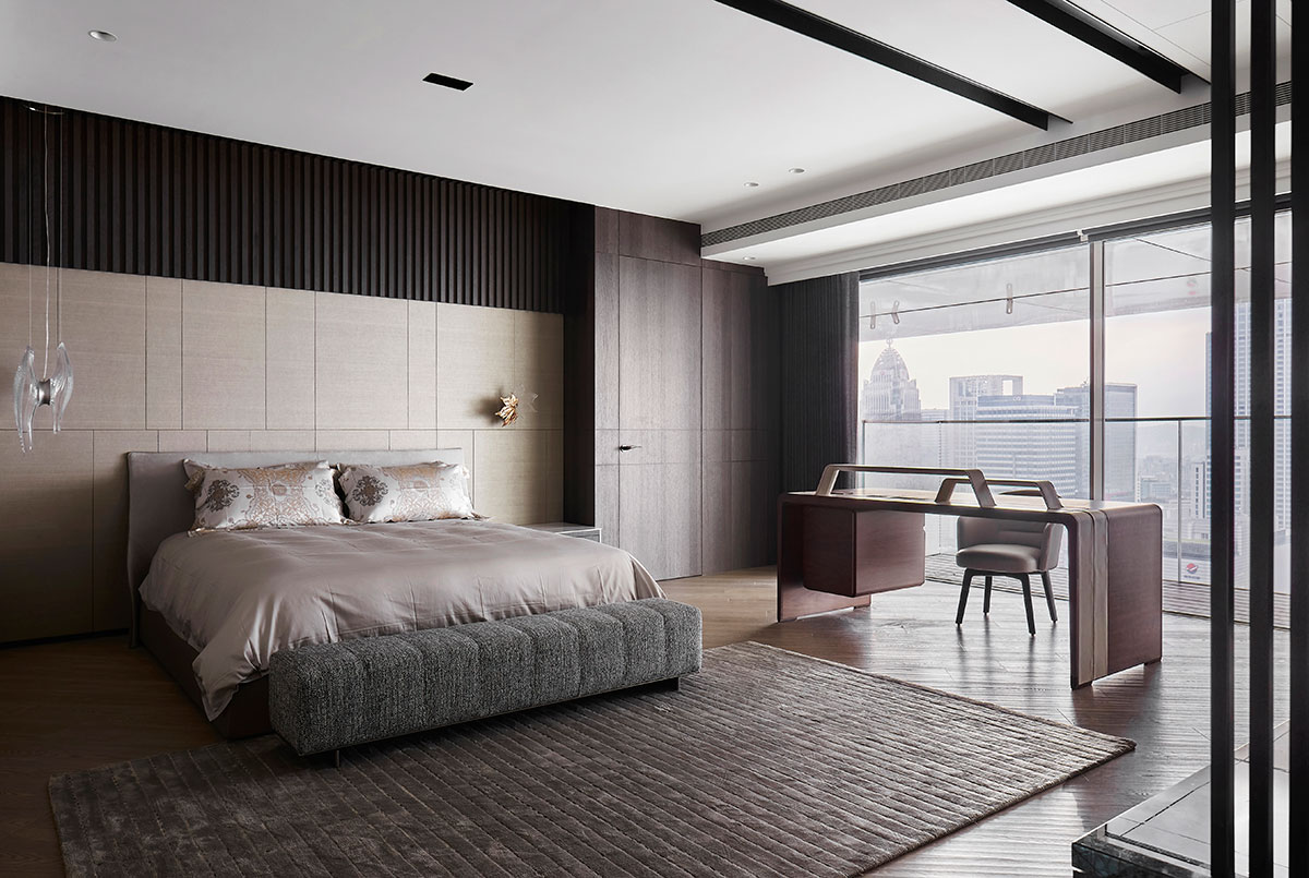 The transparent French windows of the high-rise building reflect the magnificent urban view and drag captivating night scenes into the mansion. The dark brown and light beige surroundings go with comfortable sectional sofas, agreeably bringing a pleasant family gathering time.