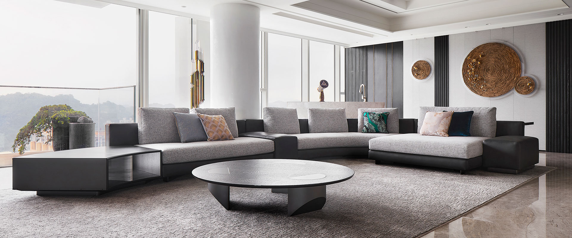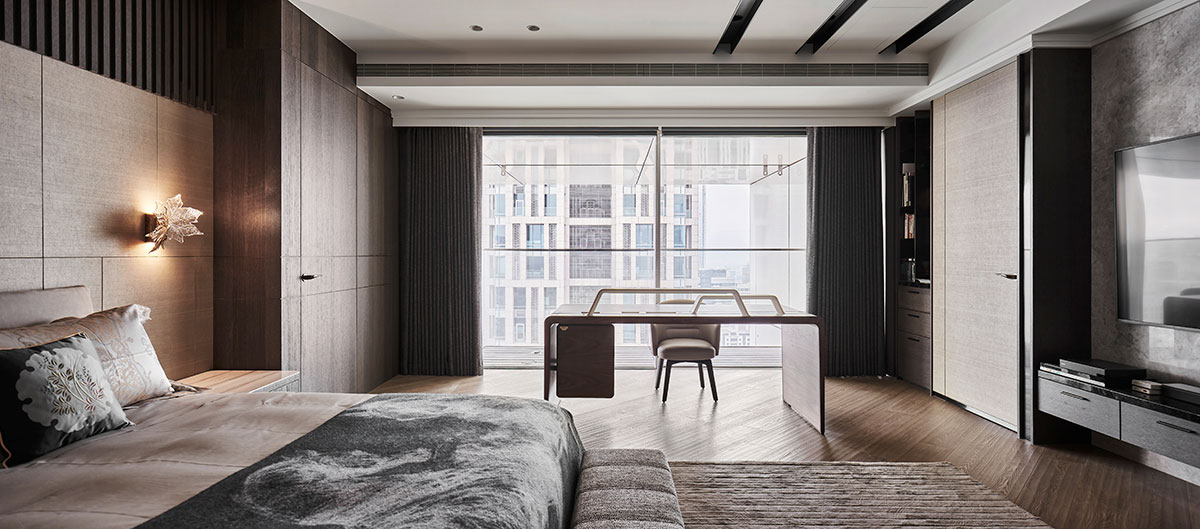通透的落地玻璃窗,映現遼闊清晰的高樓視野,將繁華的城市風光和美麗夜景引入室內,深褐色及淺米色鋪陳的生活場景,搭配舒適柔軟的沙發組,帶來與家人共度的愜意時光。